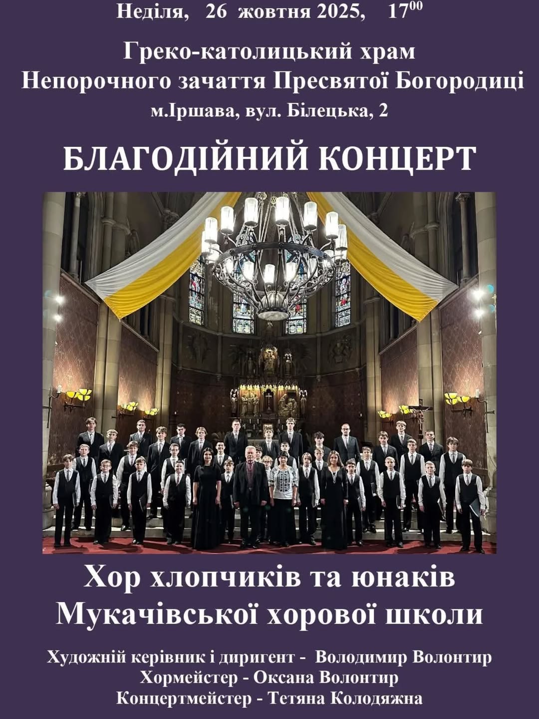 🎶🇺🇦Чудову подію для поціновувачів хорового мистецтва приготували в Іршаві! У неділю, 26 жовтня, відбудеться благодійний концерт за участю талановитого хору хлопчиків та юнаків Мукачівської хорової школи. Це унікальна можливість насолодитися вишуканими класичними та духовними творами у неповторному виконанні.