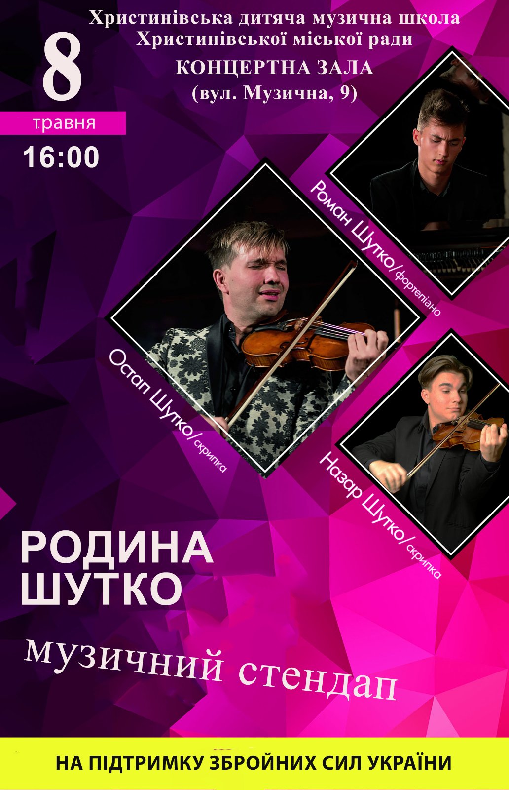 🎻🎙 Христинівська дитяча музична школа запрошує на захоплюючий концерт родини Шутко «Музичний стендап»! Відчуйте атмосферу музичного мистецтва та віртуозного звучання, яке подарує незабутні емоції.