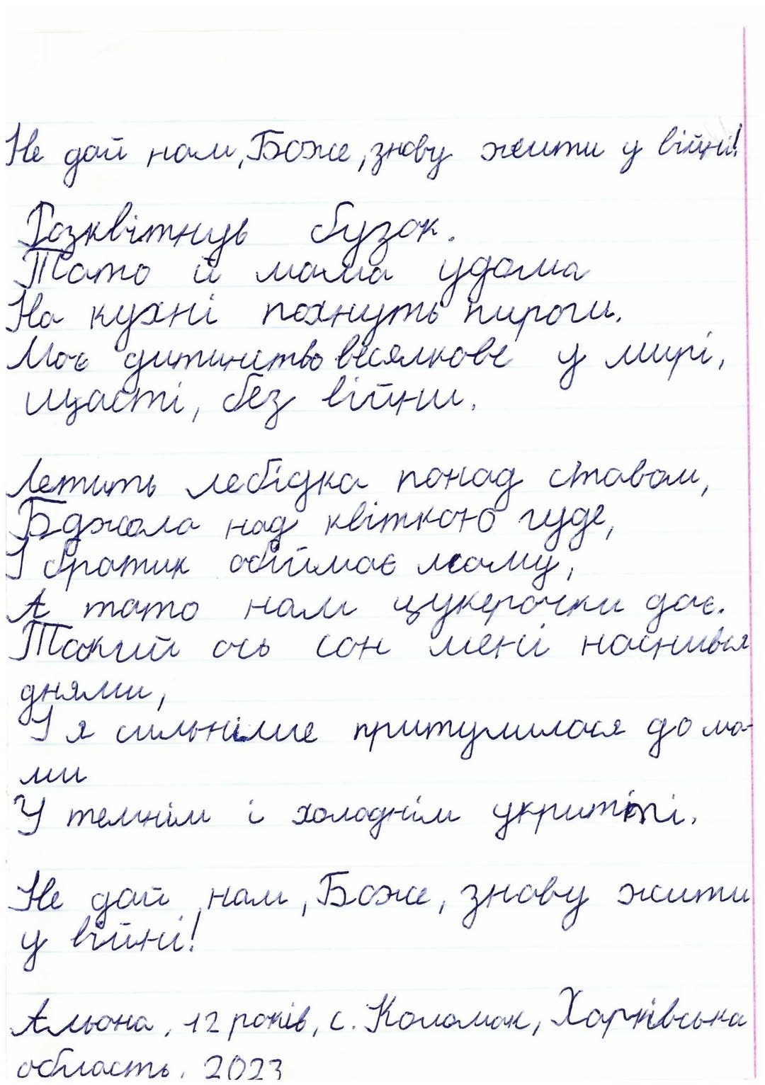 Кожне слово цього вірша пронизане щирістю та болем, але водночас і неймовірною силою духу. Це нагадування про те, що дитячі мрії мають бути чимось більшим, ніж просто бажанням вижити. Вони заслуговують на здійснення, на реалізацію в безпечному світі. Юна харків’янка, як і тисячі інших дітей, прагне відчути радість безтурботного життя, залишивши позаду страх і невизначеність. Її вірш – це заклик до всіх нас, нагадування про те, що майбутнє – за цими дітьми, і ми повинні зробити все можливе, аби їхні мрії стали реальністю. Нехай кожне дитяче бажання, висловлене в цьому вірші, знайде своє втілення, а дитинство ніколи більше не буде проходити в темряві та страху укриттів. Ми віримо, що мирне небо та щасливе дитинство – це те, чого заслуговує кожна дитина України.