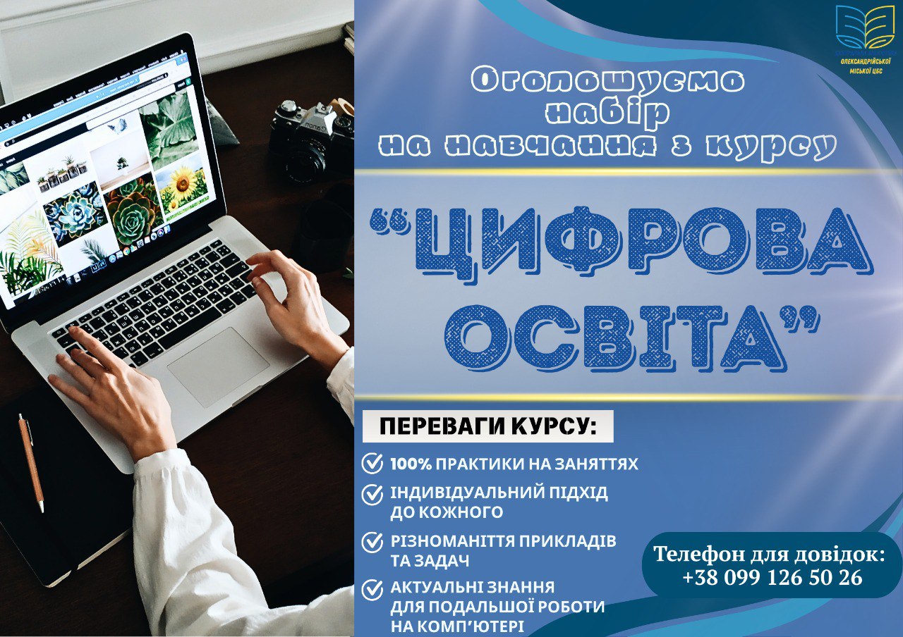 Центральна бібліотека запрошує всіх мешканців громади пройти безкоштовний курс «Цифрова освіта». Ця програма розроблена спеціально для тих, хто прагне освоїти комп’ютер з нуля, здобути базові цифрові навички для подальшого професійного зростання, а також впевнено орієнтуватися в онлайн-середовищі. Наші заняття допоможуть вам ефективно шукати потрібну інформацію в інтернеті, забезпечать знання для безпечного спілкування в мережі, навчать працювати з основними програмами та сервісами, а також нададуть можливість створювати власний цифровий контент. Навчання стартує 1 жовтня і триватиме до 31 травня. Для запису звертайтеся за адресою: вулиця Григорія Усика, 41. Також ви можете легко заповнити онлайн-анкету за посиланням: https://docs.google.com/forms/d/1I4gnjf8eXs-mYtBgm-mZ7QogCkC4Y2YZE5rF6vfTLfM/edit. Для отримання додаткової інформації телефонуйте: +38 099-126-50-26.