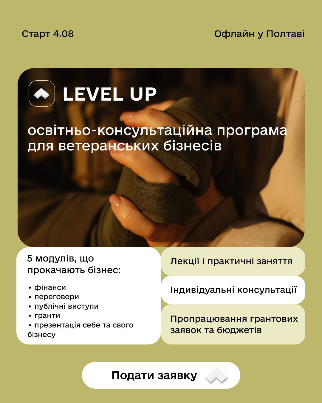 ✅Центр підтримки підприємців Дія.Бізнес у Полтаві оголошує набір на освітньо-консультаційну програму „Level Up”, розроблену спеціально для ветеранів, ветеранок та їхніх партнерів, які вже ведуть власну справу