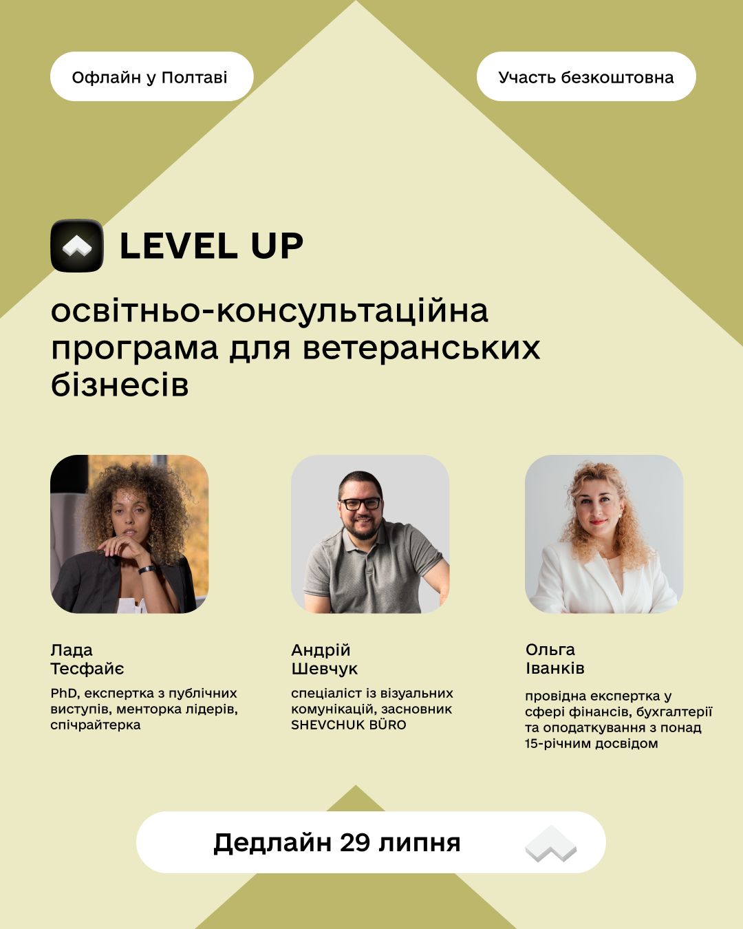 ✅Центр підтримки підприємців Дія.Бізнес у Полтаві оголошує набір на освітньо-консультаційну програму „Level Up”, розроблену спеціально для ветеранів, ветеранок та їхніх партнерів, які вже ведуть власну справу