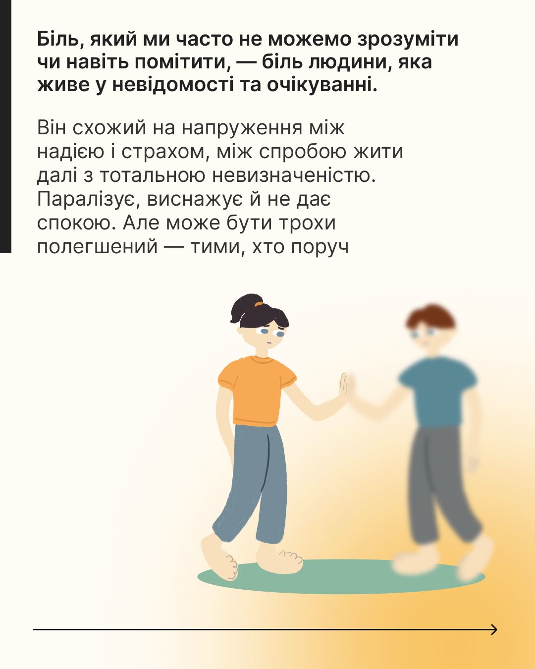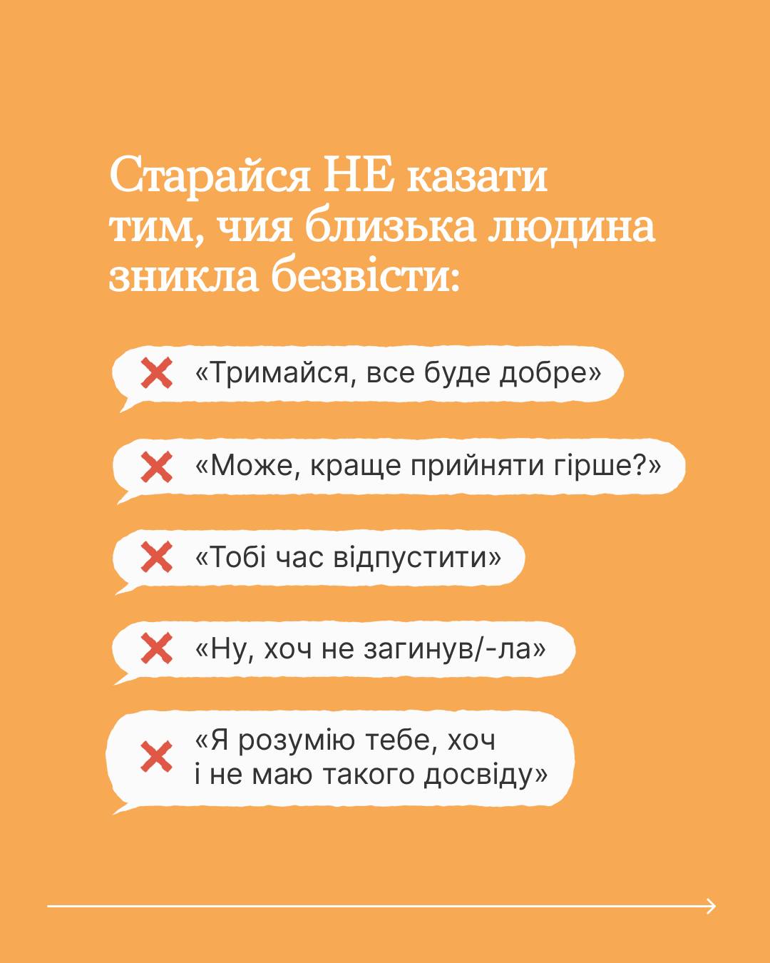 Нагадуємо про основні способи, як ви можете підтримати тих, у кого близька людина зникла безвісти. Кожна допомога, навіть найменша, має велике значення для родин, які перебувають у стані невизначеності та болю. Розгляньте можливість репосту цієї інформації, щоб допомогти іншим дізнатися, як підтримати таких людей.