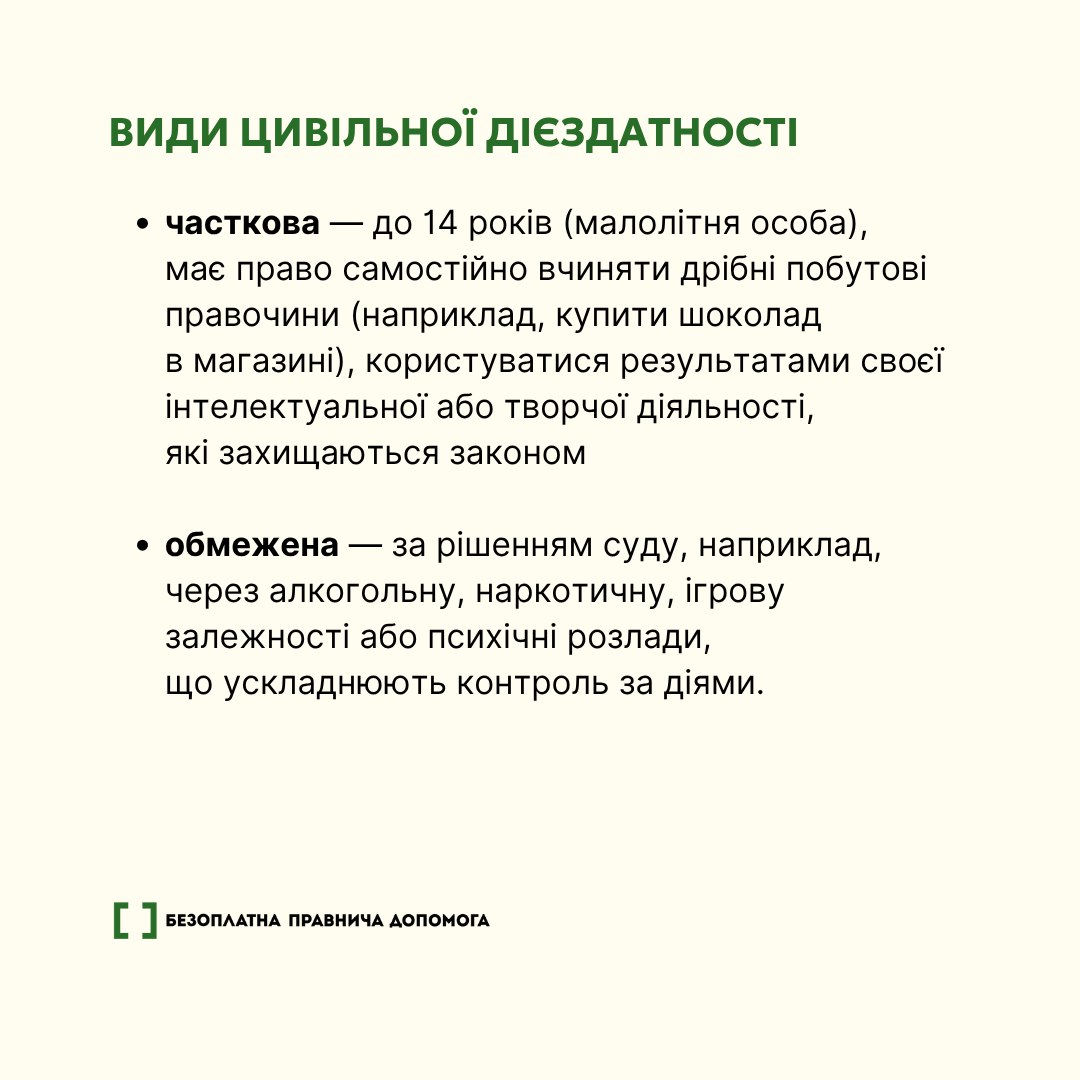 🟩 Розуміння цивільної дієздатності є ключовим аспектом прав та обов’язків кожної людини. Цивільна дієздатність визначає здатність особи усвідомлювати свої дії, керувати ними, нести за них відповідальність, а також набувати прав та виконувати обов’язки. Ця здатність не є сталою і залежить від низки факторів, таких як вік, психічний стан та інші індивідуальні обставини.