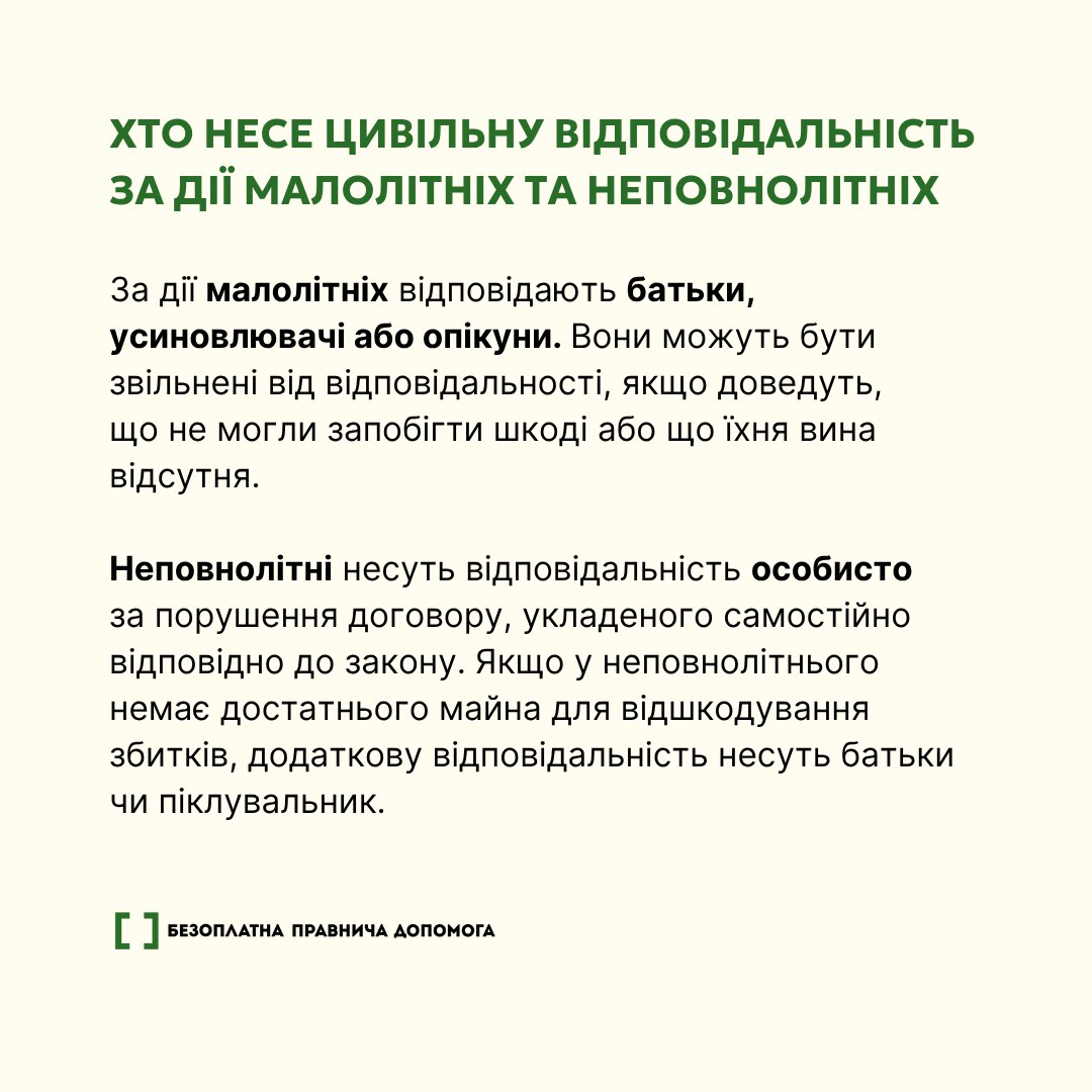 * **Юридична відповідальність:** Повнолітні та дієздатні особи несуть повну відповідальність за вчинені ними правопорушення, як цивільно-правові, так і кримінальні.