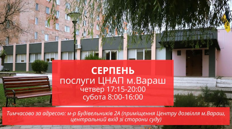 Нагадуємо, що наразі робота ЦНАП тимчасово відбувається за новою адресою: місто Вараш, мікрорайон Будівельників, 2А. Це приміщення відоме як Центр дозвілля міста Вараш. Будь ласка, використовуйте центральний вхід, що розташований зі сторони суду. Ми робимо все можливе, щоб адаптуватися та продовжувати надавати якісні послуги.