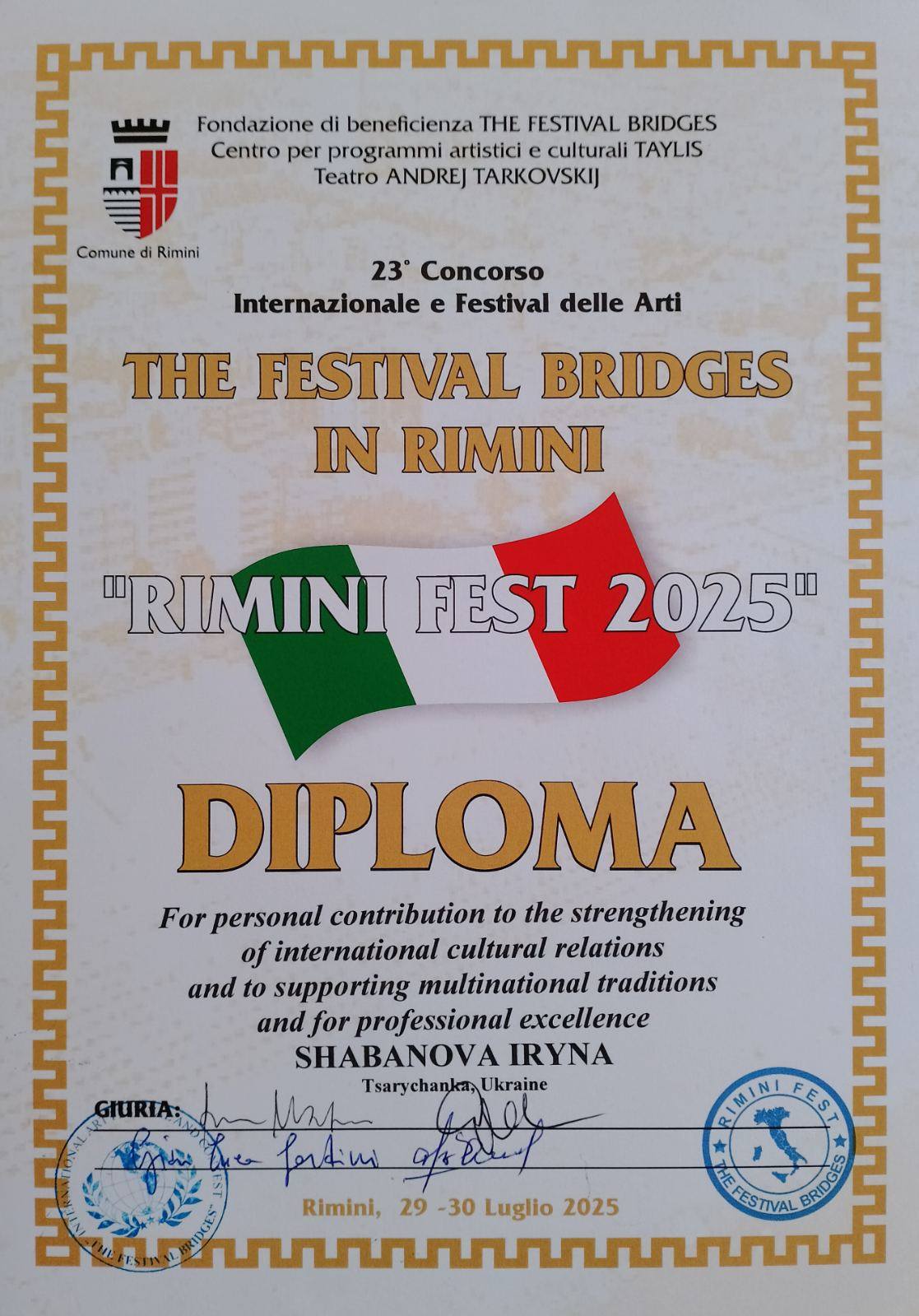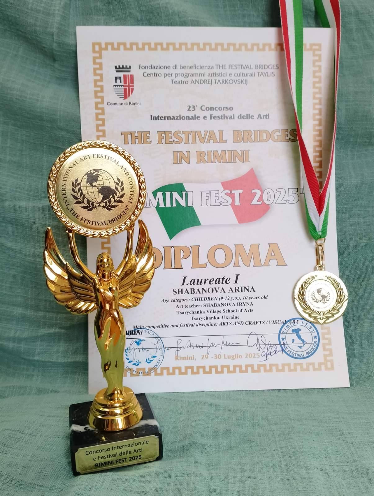 Вітаємо юну художницю Аріну Шабанову з блискучою перемогою на Міжнародному фестивалі “Rimini Fest 2025”! Бажаємо їй невичерпного натхнення, нових звершень та подальших успіхів у світі мистецтва. Нехай її творчий шлях буде сповнений яскравих подій та визнань.