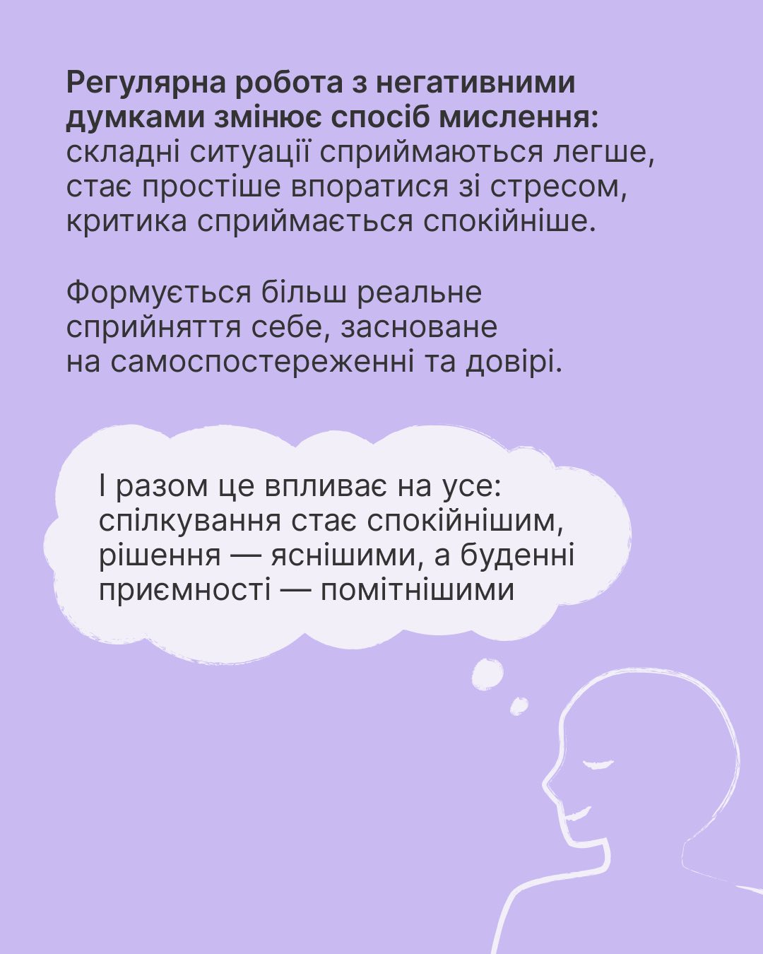 Часто відчуваєш невдоволення собою та результатами своїх дій? Це знайоме багатьом, але є шляхи покращити своє самовідчуття. Ключ до цього – навчитися керувати своїми думками. Якщо розрізняти негативні думки, відстежувати їх походження та свідомо намагатися змінювати, можна суттєво знизити рівень тривоги та значно покращити якість свого життя.