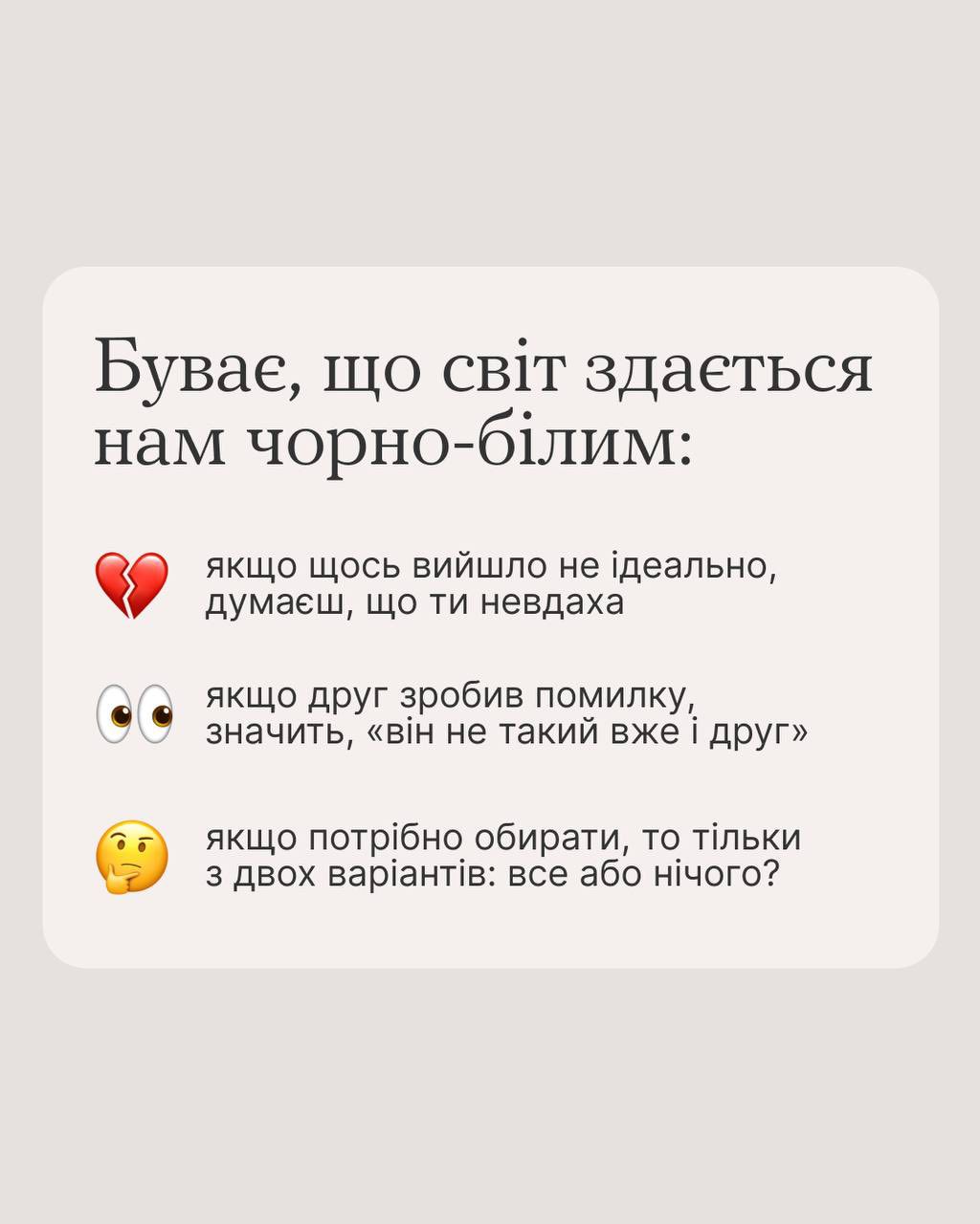 Часто ми сприймаємо життя у чорно-білих тонах, але насправді між цими крайнощами існує цілий спектр емоцій та станів. Важливо навчитися бачити та розрізняти ці відтінки, адже саме в них криється справжня глибина нашого досвіду. Всеукраїнська програма з ментального здоров’я «Ти як?» підготувала карусель, яка допоможе вам краще зрозуміти цей емоційний спектр та розвинути свою психологічну стійкість.