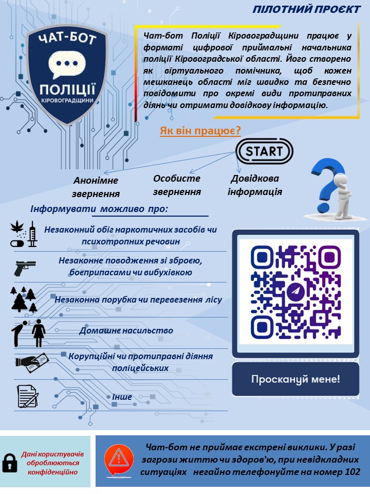 15 вересня 2025 року в Кіровоградській області було запущено пілотний проєкт «Чат-бот Поліції Кіровоградщини». Цей інноваційний ресурс, створений у форматі цифрової приймальні начальника Головного управління Національної поліції, покликаний значно спростити та убезпечити процес комунікації між громадянами та правоохоронними органами. Відтепер мешканці регіону мають зручний інструмент для оперативного повідомлення про низку важливих правопорушень, що сприятиме підвищенню загальної громадської безпеки.