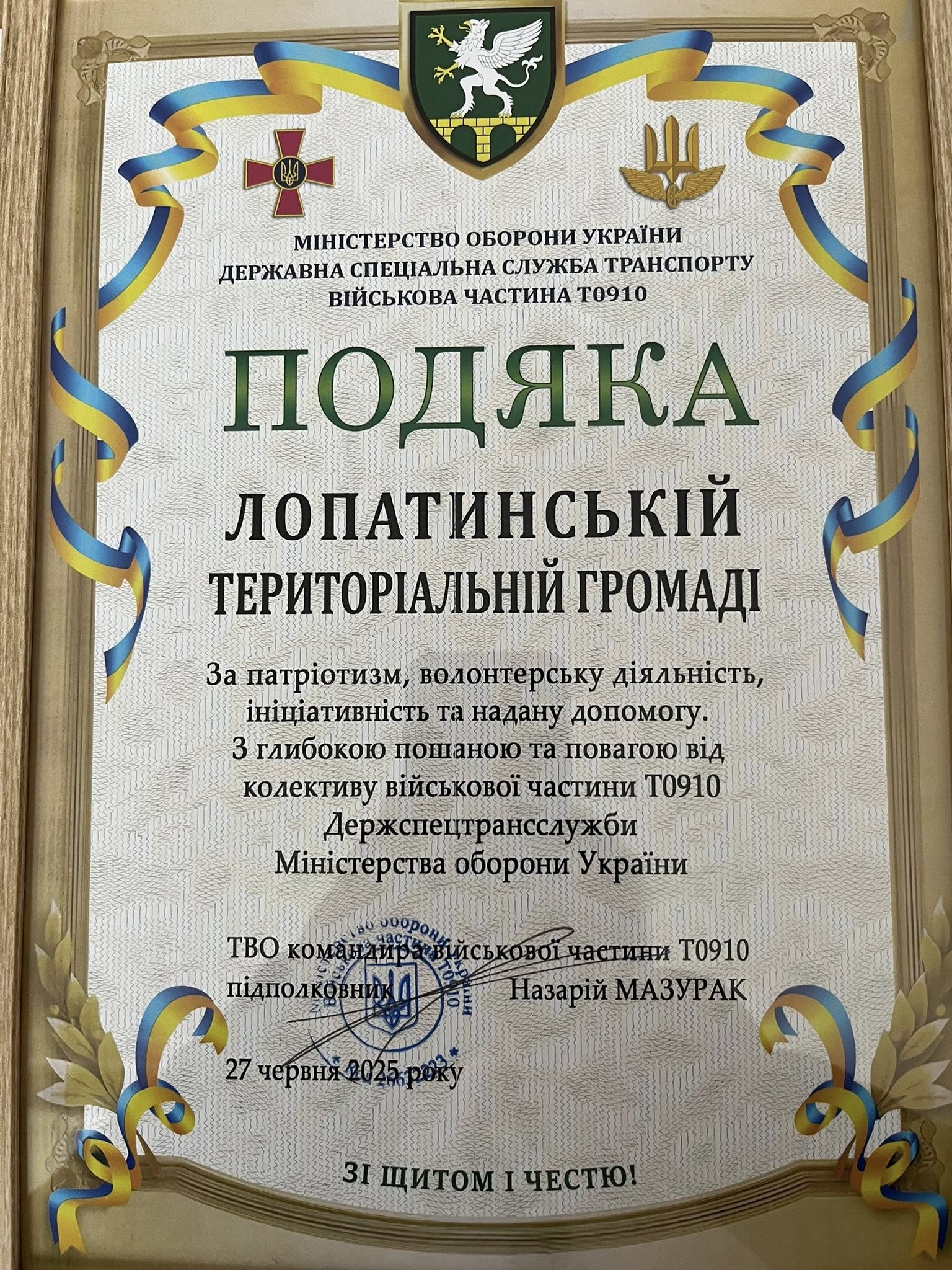 🔵🟡 Чергова подяка від військових ЗСУ🇺🇦 Лопатинській територіальній громаді за надану допомогу. Сьогодні представник тимчасово виконуючого обов’язки командира військової частини Т 0910, Назарій Мазурак, передав селищному голові Олегу Микитину офіційну Подяку від Захисників України🇺🇦. Ця відзнака була вручена від командування та особового складу в/ч Т 0910, підкреслюючи важливість підтримки, яку надає громада. Олег Васильович зазначив: 🗨️«Ця подяка – це визнання не лише моїх зусиль, а й праці всієї нашої громади. Ми пам’ятаємо нашого односельця, воїна Небесної Сотні – Сцьольного Маряна, який служив у транспортній службі ЗСУ, зокрема у в/ч Т 0910. Зараз наші земляки продовжують службу, ризикуючи життям заради нашої Перемоги.🇺🇦 Для нас велика честь і відповідальність підтримувати таких гідних синів громади. Кожен знак уваги від Оборонців свідчить про те, що наші зусилля не марні. Допомога громади є щитом і опорою для наших Захисників. Ми не маємо права зупинятися, адже війна триває, і кожен день має значення. Тільки разом, допомагаючи та підтримуючи одне одного, ми наближаємо нашу Перемогу.🇺🇦❗». Ми висловлюємо щиру подяку ЗСУ🇺🇦 за кожен новий день, за можливість жити і працювати на рідній землі❗ Слава Україні🇺🇦! Її Героям слава!