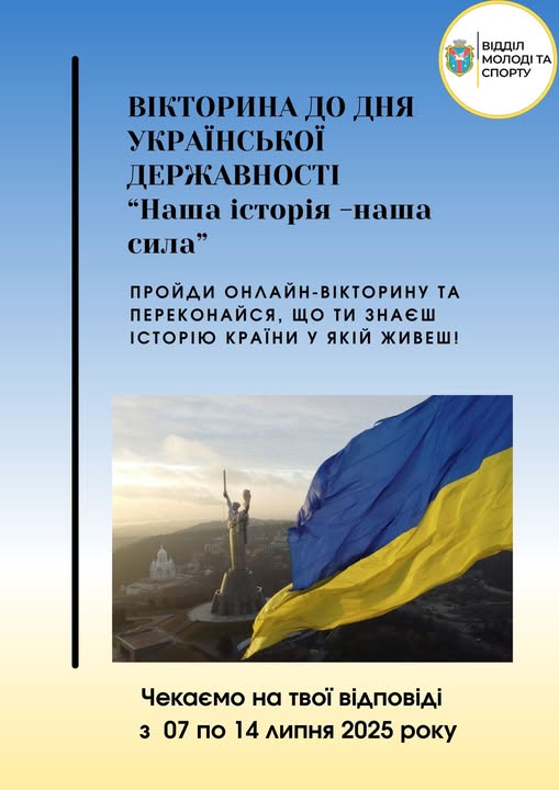 📅 Це свято Україна відзначає 15 липня і відділ молоді та спорту Жмеринської міської ради запрошує жителів громади долучитися до онлайн-вікторини, що присвячена нашій державності: