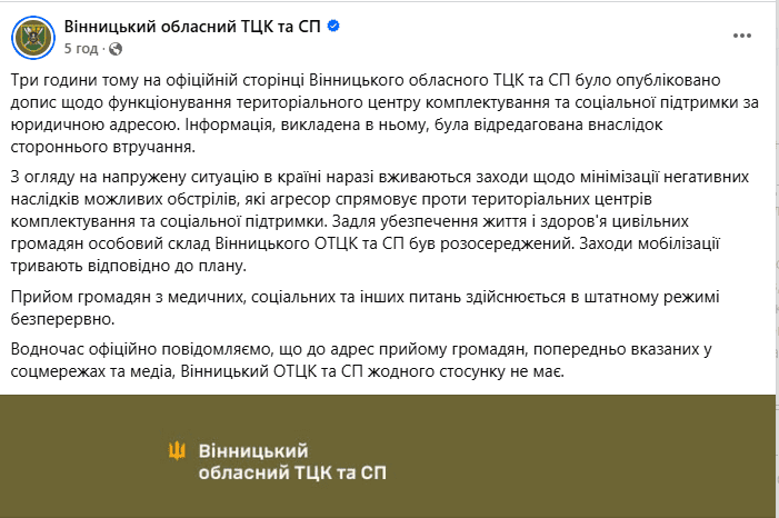 «Три години тому на офіційній сторінці Вінницького обласного ТЦК та СП було опубліковано допис щодо функціонування територіального центру комплектування та соціальної підтримки за юридичною адресою. Інформація, викладена в ньому, була відредагована внаслідок стороннього втручання», — йдеться у повідомленні.