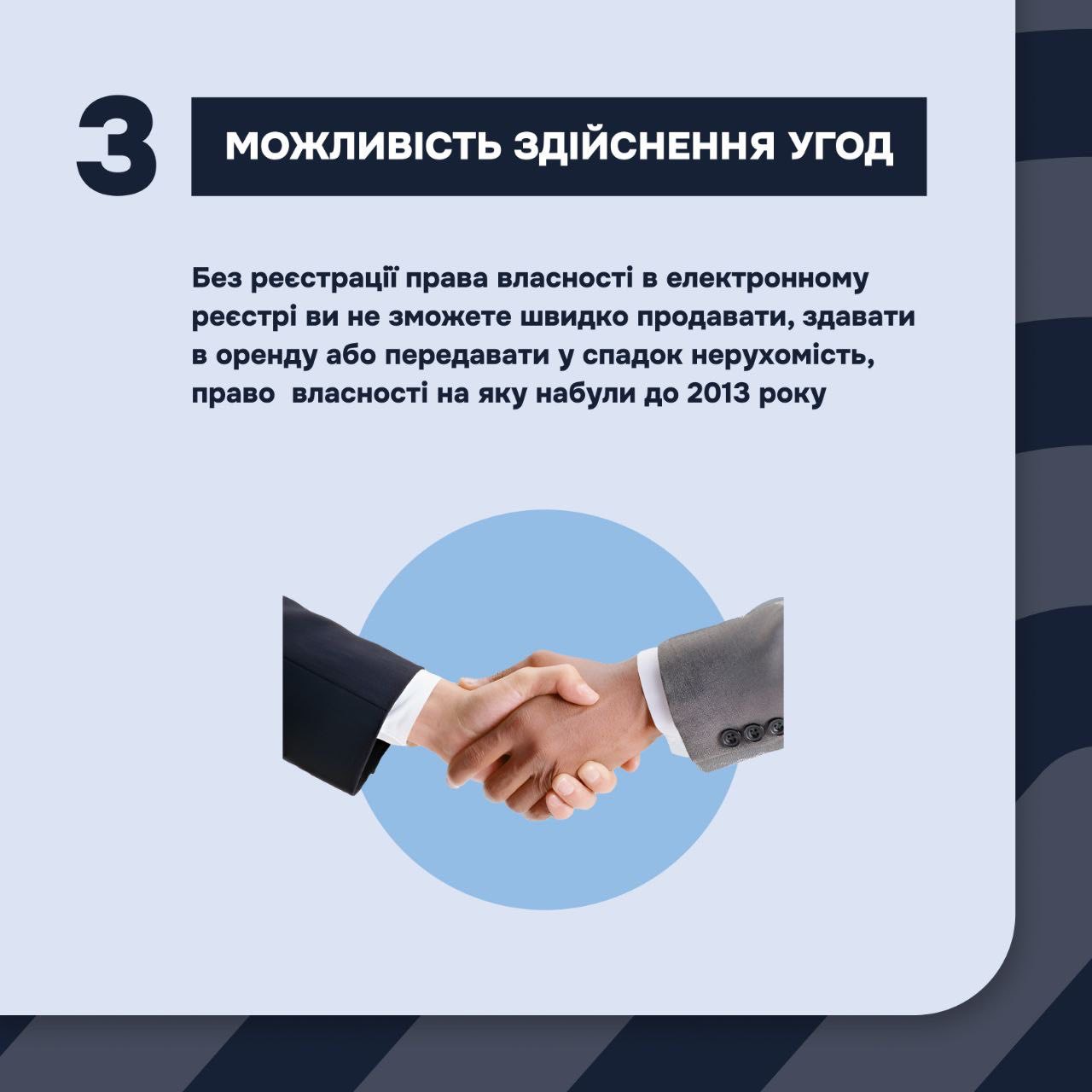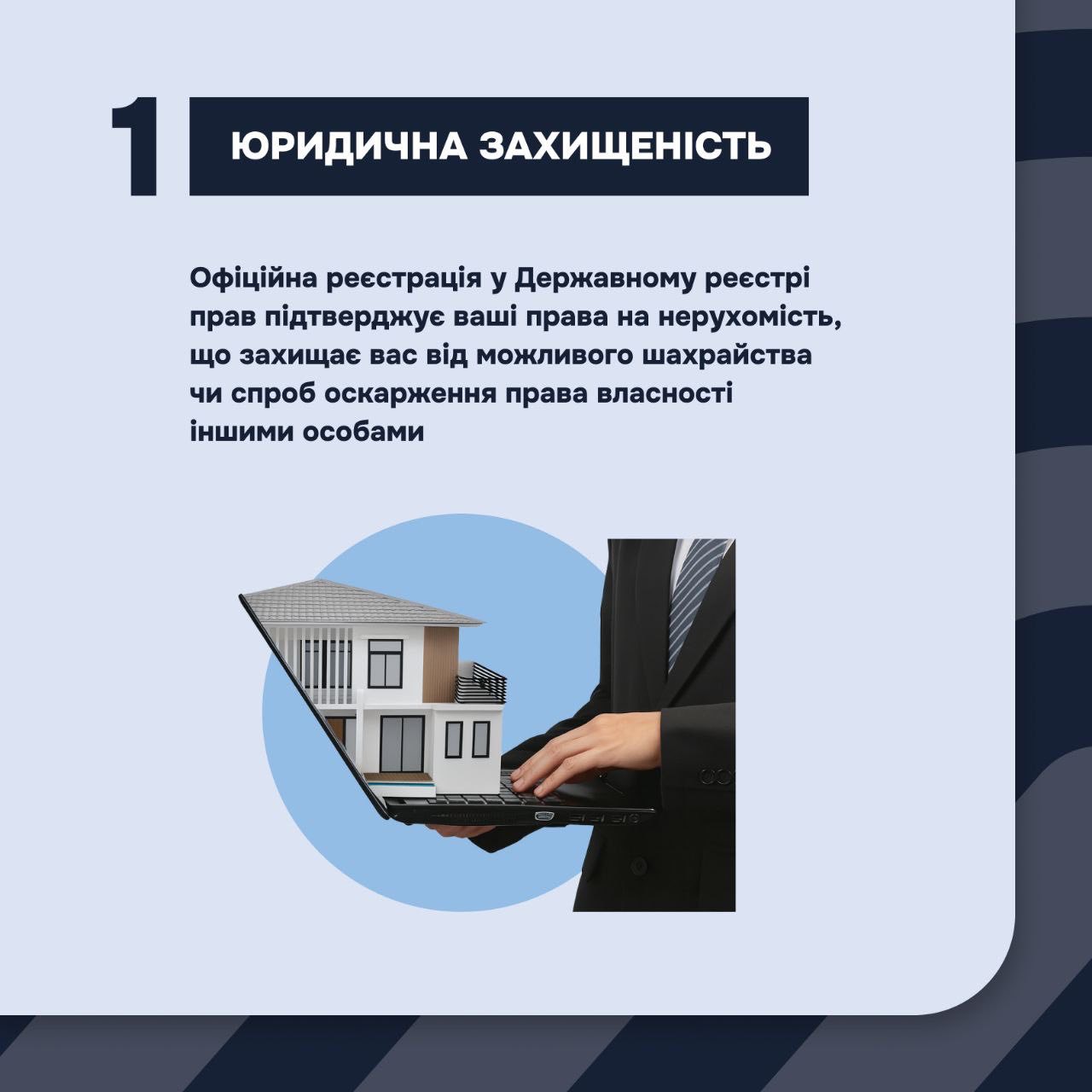 • ✅ Особливо під час дії воєнного стану, реєстрація вашого права власності стає надзвичайно важливою для належного захисту майна та для можливості отримання необхідних державних компенсацій.