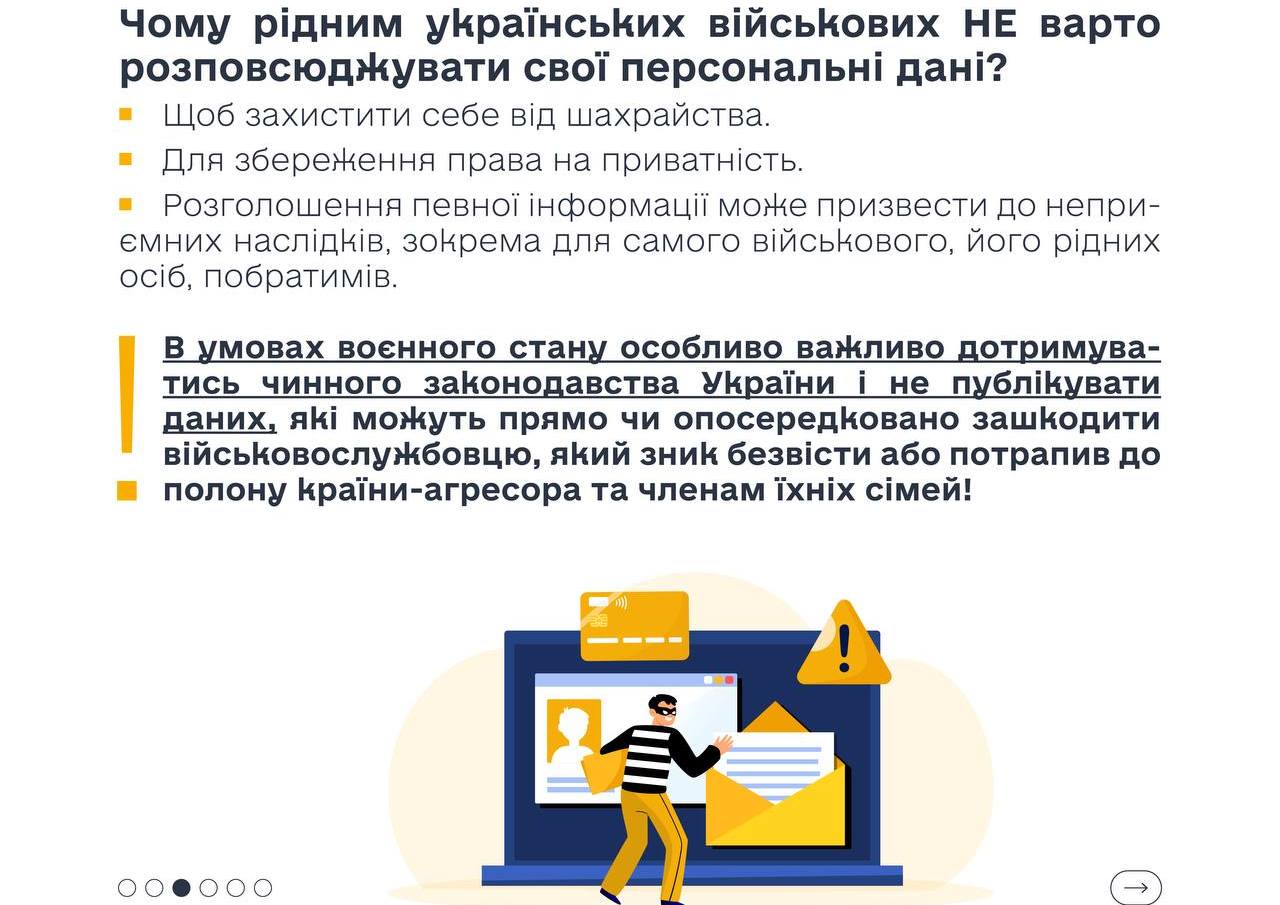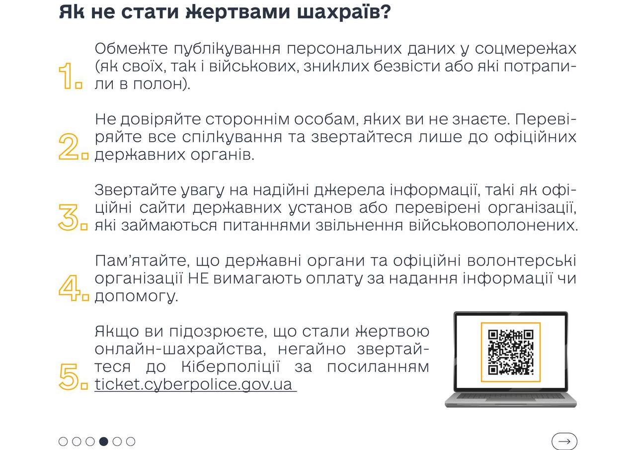 Для отримання більш детальної інформації про схеми шахрайства, пов’язані з темою військовополонених та зниклих безвісти, зверніться до спеціальної брошури: https://bit.ly/4jDshbQ. Пам’ятайте, що обізнаність та пильність – ваш найкращий захист. Захист персональних даних – це запорука вашої безпеки та безпеки ваших рідних.