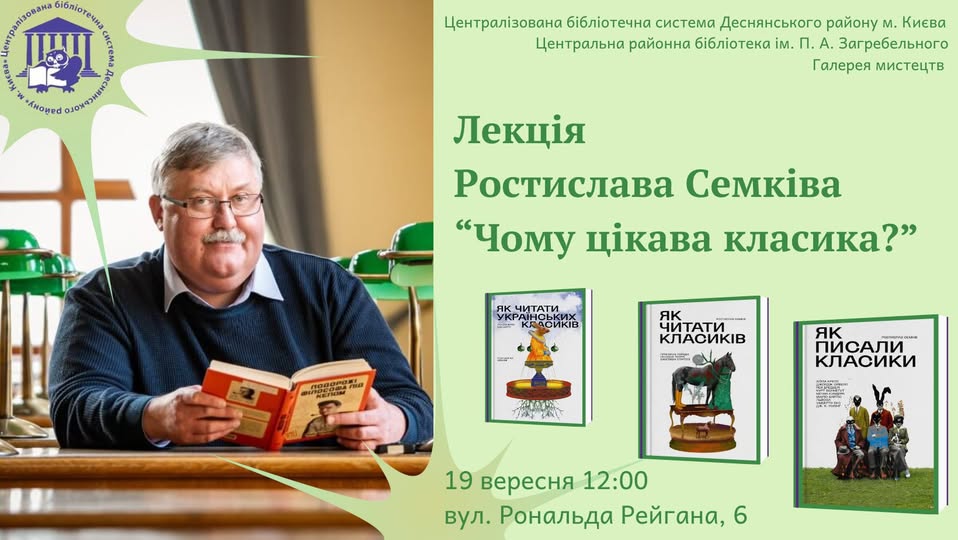 ЦРБ ім. П. Загребельного та Галерея мистецтв запрошують усіх шанувальників слова на унікальну лекцію від відомого літературознавця, перекладача та публіциста Ростислава Семківа. Це подія, яка допоможе глибше зрозуміти, чому класика продовжує захоплювати та надихати сучасних читачів.