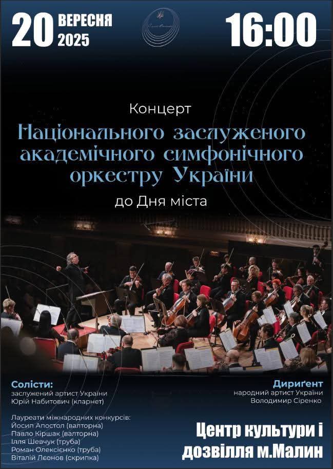 ✨ Велика новина для всіх шанувальників симфонічної музики! Цієї суботи, 20 вересня, о 16:00 в Центрі культури та дозвілля відбудеться незабутній концерт за участю Національного заслуженого академічного симфонічного оркестру України. Ця подія приурочена до святкування Дня міста Малина! 🎶