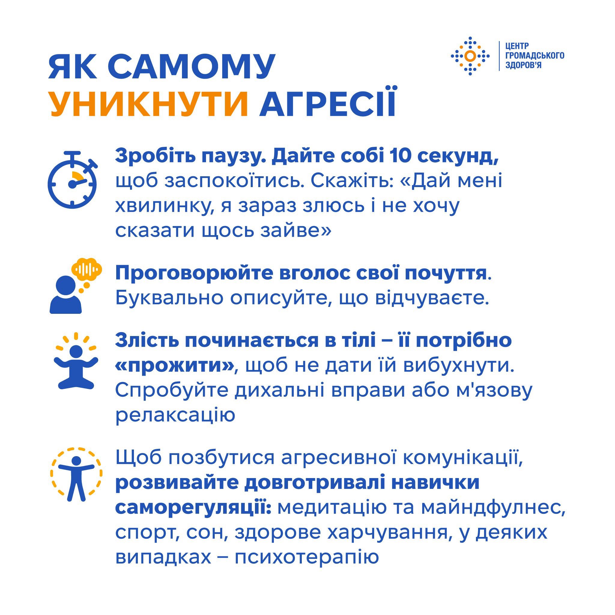 Більше про те, як реагувати на чужу агресію та як самому уникати агресивної поведінки, читайте в інфографіці @Центр громадського здоровʼя України ⬇️