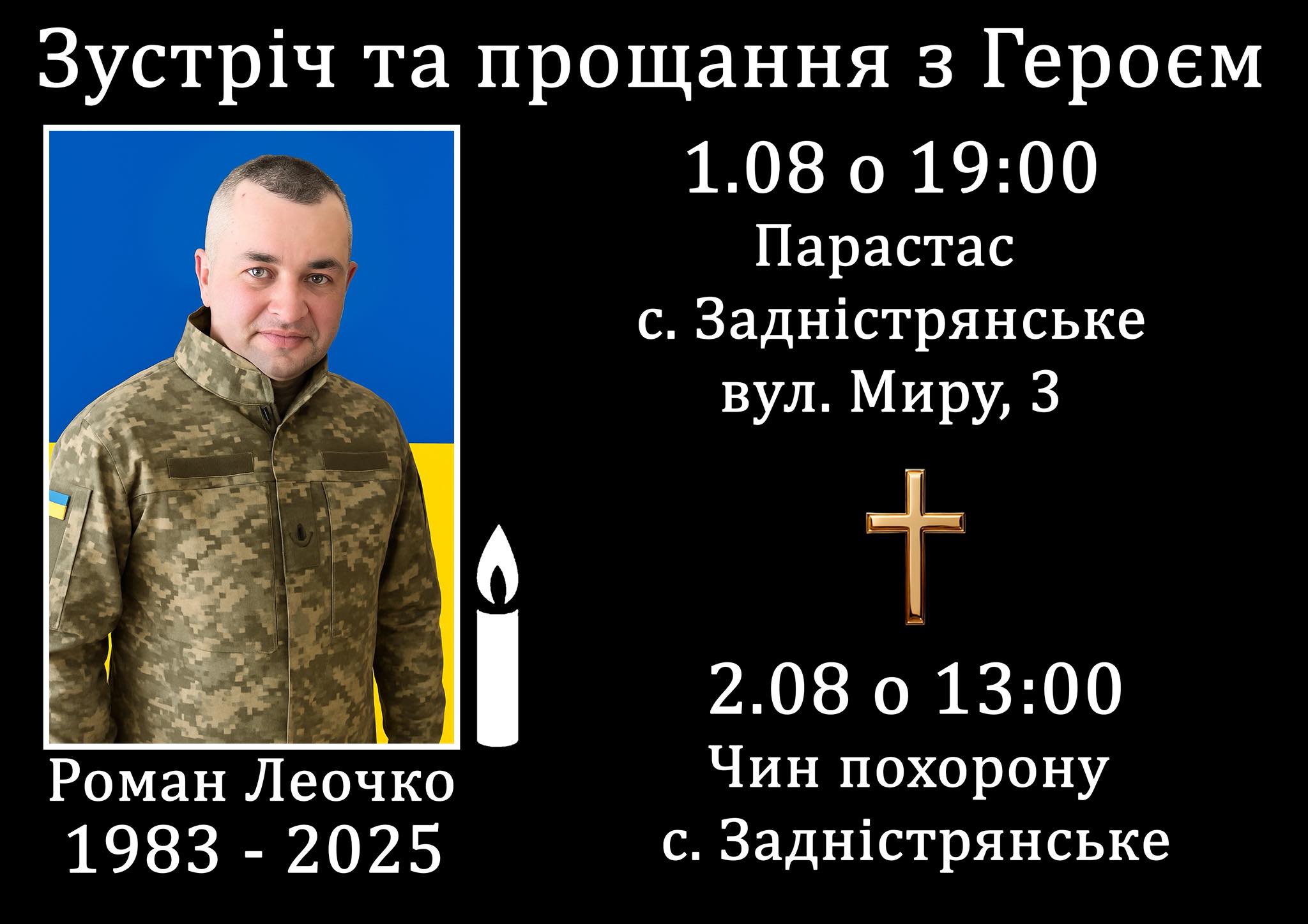 ✝️Чин похорону відбудеться 2.08 о 13:00 у селі Задністрянське. Ми зберемося, щоб провести Героя в останню земну подорож.