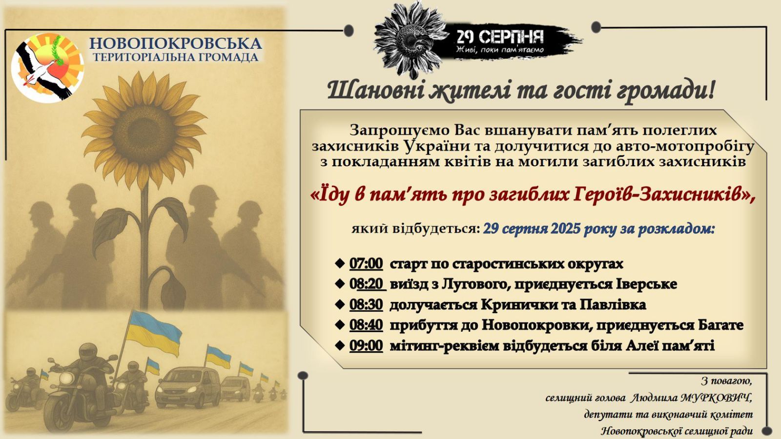📢 Шановна громадо!🌻 У День пам’яті захисників України, 29 серпня, запрошуємо всіх небайдужих взяти участь у пам’ятному авто-мотопробігу з покладанням квітів на могили полеглих Героїв. Наша акція, «Їду в пам’ять про загиблих Героїв-Захисників», є виразом глибокої вдячності й шани тим, хто віддав своє життя заради миру та свободи України. Цей шлях пам’яті – це наша можливість вшанувати подвиг тих, хто назавжди залишиться в серцях вдячних поколінь. Приєднуйтесь до нас 29 серпня 2025 року. Збір розпочнеться о 07:00. Маршрут пробігу пролягатиме через старостинські округи, розпочинаючи о 07:00. О 08:20 планується зупинка в Луговому, де до нас приєднається Іверське. Далі, о 08:30, ми відвідаємо Кринички та Павлівку. О 08:40 заїдемо до Новопокровки, до якої долучиться Багате. Кульмінацією нашого зібрання стане мітинг-реквієм біля Алеї пам’яті о 09:00.💙💛 Давайте об’єднаємося у спільній дорозі пам’яті, аби вклонитися нашим Героям.