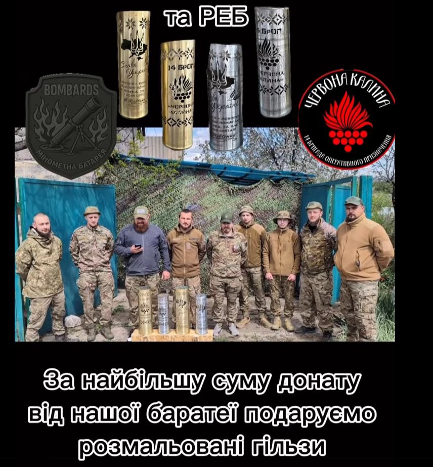**Особлива подяка для найбільших благодійників!** Четверо людей, які зроблять найбільші пожертви, отримають унікальні подарунки – авторські гільзи з латуні та заліза, розписані власноруч.