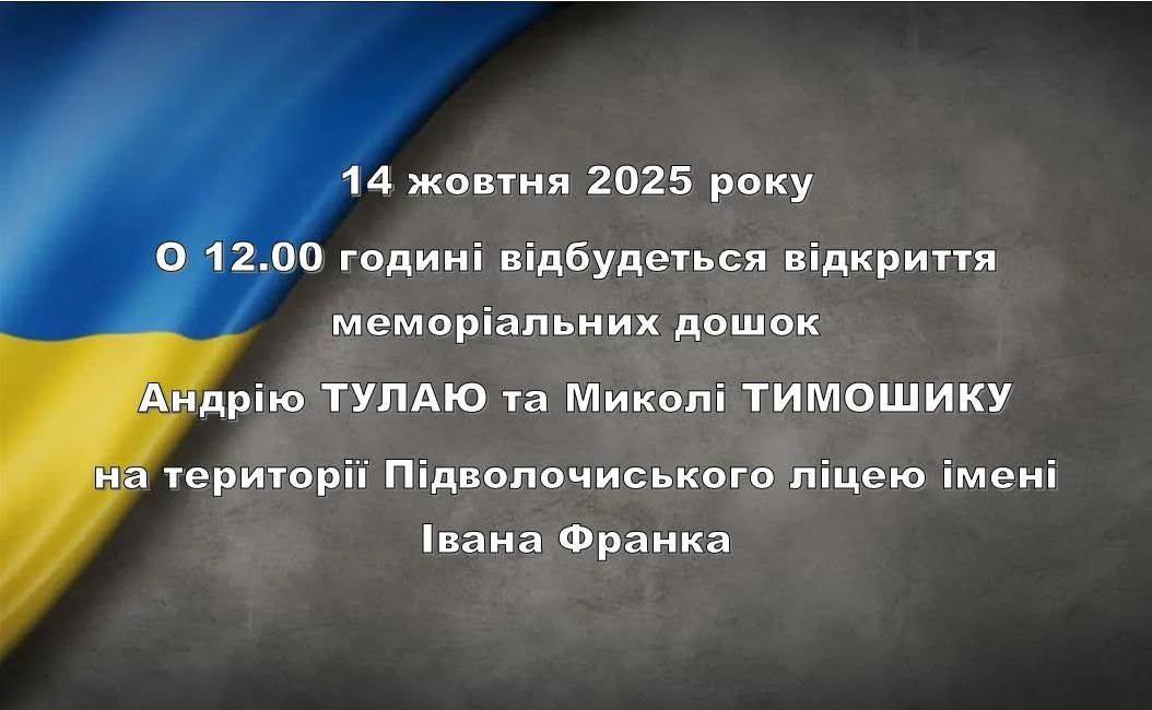 14 жовтня о 12:00 на території Підволочиського ліцею імені Івана Франка відбудеться урочисте відкриття меморіальних дошок, присвячених нашим землякам, Андрію Тулаю та Миколі Тимошику. Ці Герої віддали своє найцінніше — життя — за свободу та незалежність України. Їхній подвиг назавжди залишиться в наших серцях та в історії. Ми запрошуємо кожного небайдужого громадянина долучитися до цього скорботного, але водночас сповненого гордості заходу. Вшануймо разом пам’ять тих, хто боровся до останнього подиху за наше майбутнє. 🇺🇦