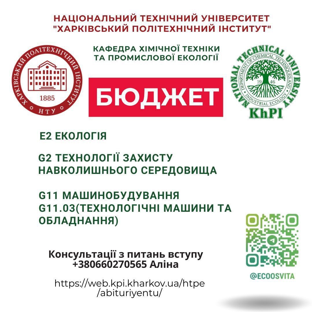 Кафедра хімічної техніки та промислової екології Національного технічного університету “Харківський політехнічний інститут” запрошує Вас до вступу на БЮДЖЕТ! на спеціальності: