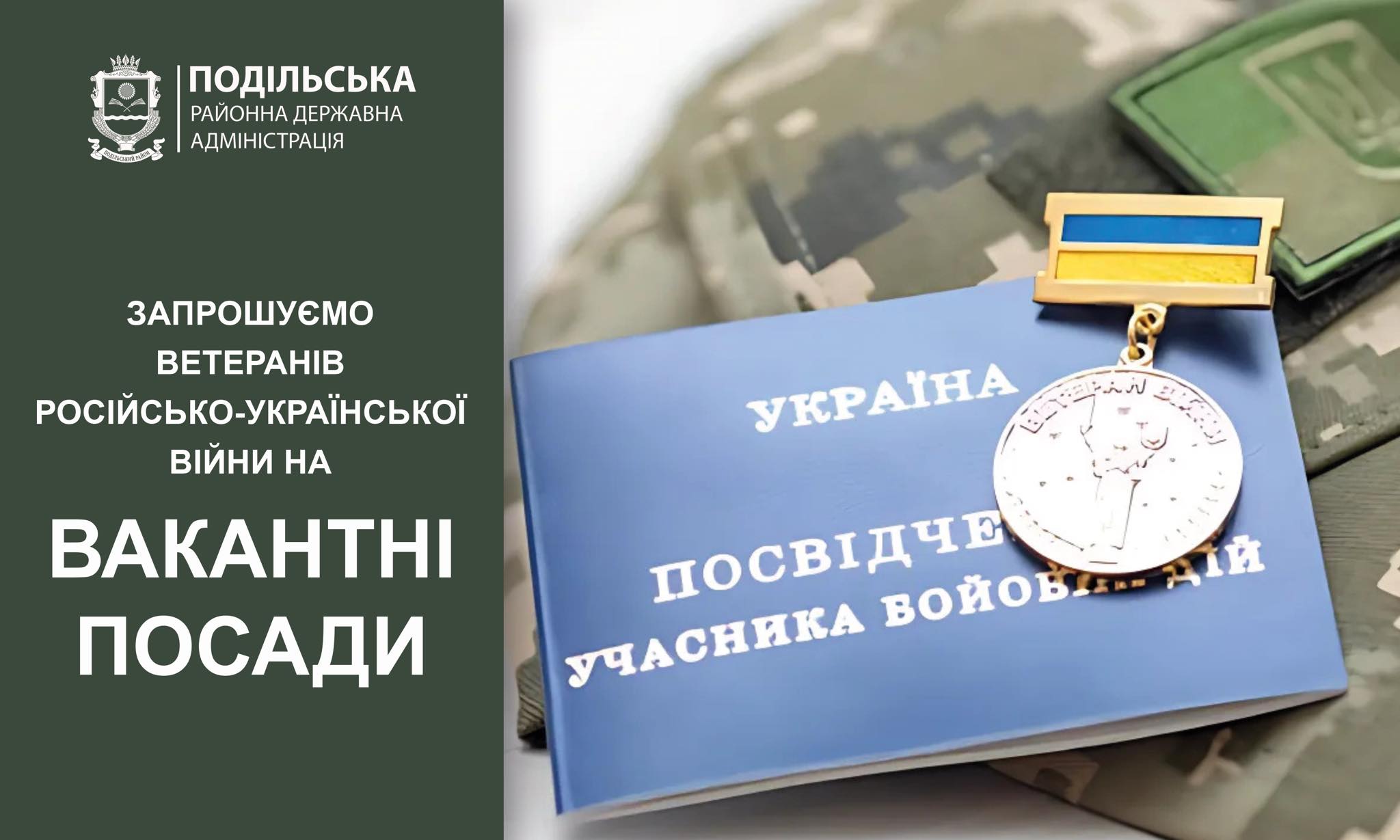 Шановні ветерани та ветеранки російсько-української війни, захисники та захисниці нашої держави! Ваша відвага, самопожертва та незламний дух є фундаментом нашої незалежності та майбутнього. Подільська районна державна адміністрація, глибоко цінуючи ваш безцінний досвід, відданість Україні та активну громадянську позицію, щиро запрошує вас приєднатися до нашої професійної команди. Ми прагнемо створити всі умови для успішної інтеграції ветеранів у цивільне життя, надаючи можливості для подальшого служіння українському народу вже на мирній ниві – у сфері державного управління.