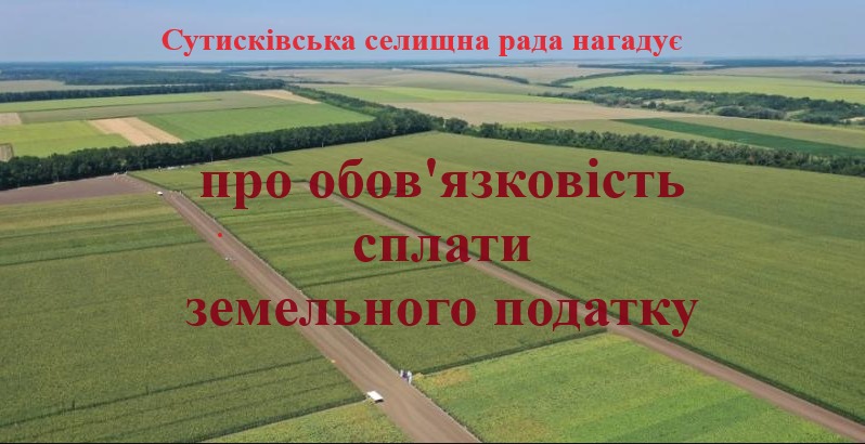 Сутисківська селищна рада нагадує про ваше конституційне та законне обов’язок – своєчасну сплату земельного податку. Це важливий внесок у розвиток нашої громади, фінансування місцевих потреб та покращення інфраструктури.