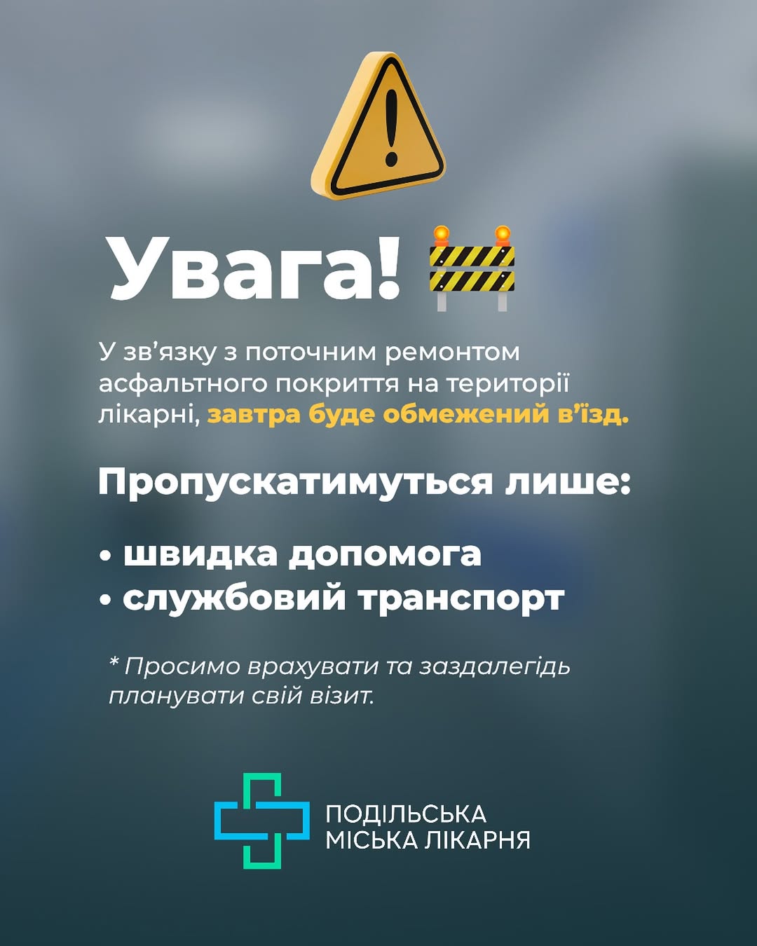 🔔 Шановні відвідувачі та персонал! Інформуємо вас про проведення важливих ремонтних робіт на території нашої лікарні, які розпочнуться вже завтра. Основні роботи будуть зосереджені на відновленні асфальтного покриття.