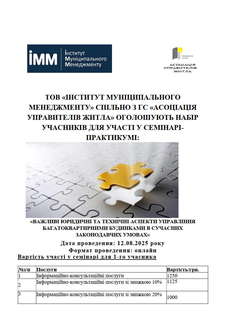 Семінар на тему: «Важливі юридичні та технічні аспекти управління багатоквартирними будинками в сучасних законодавчих умовах» проходитиме 12 серпня 2025 року в онлайн форматі.