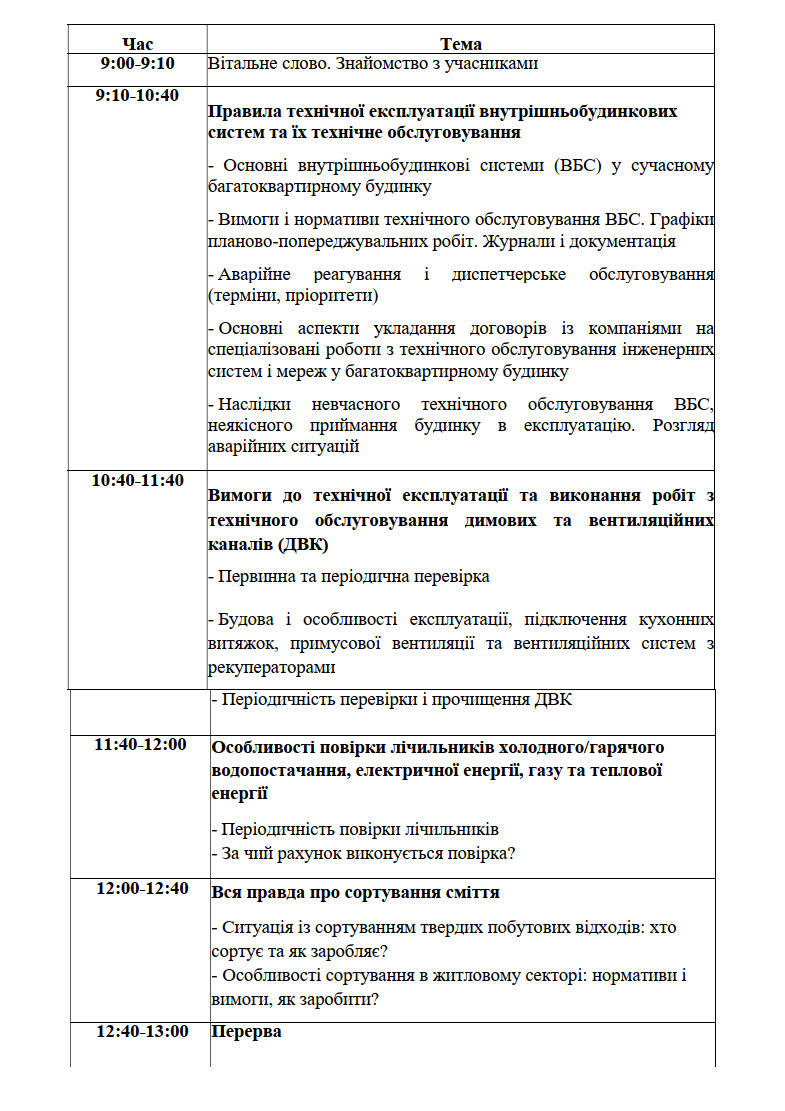 Таким чином, під час проведення запланованого заходу фахівці Інституту муніципального менеджменту детально розкриють вищевказані питання, закцентують увагу учасників на найважливіших моментах, поділяться практичними порадами щодо застосування важливих рішень у практичній діяльності управителів багатоквартирних будинків та ОСББ.