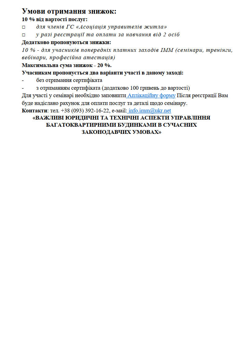 Інститут муніципального менеджменту спільно з Асоціацією управителів житла у червні проводитимуть черговий семінар-практикум, що стосується актуальних питань роботи управителів багатоквартирних будинків та ОСББ в сучасних законодавчих умовах.