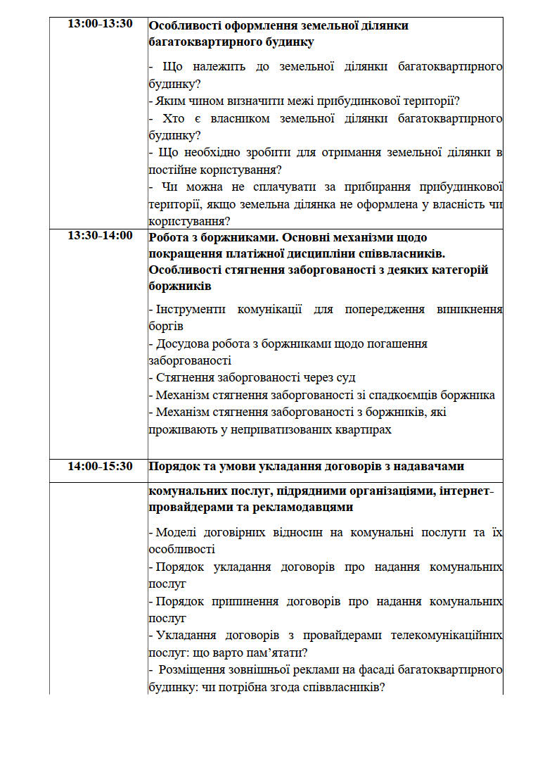 – Робота з боржниками. Основні механізми щодо покращення платіжної дисципліни співвласників. Особливості стягнення заборгованості з деяких категорій боржників;