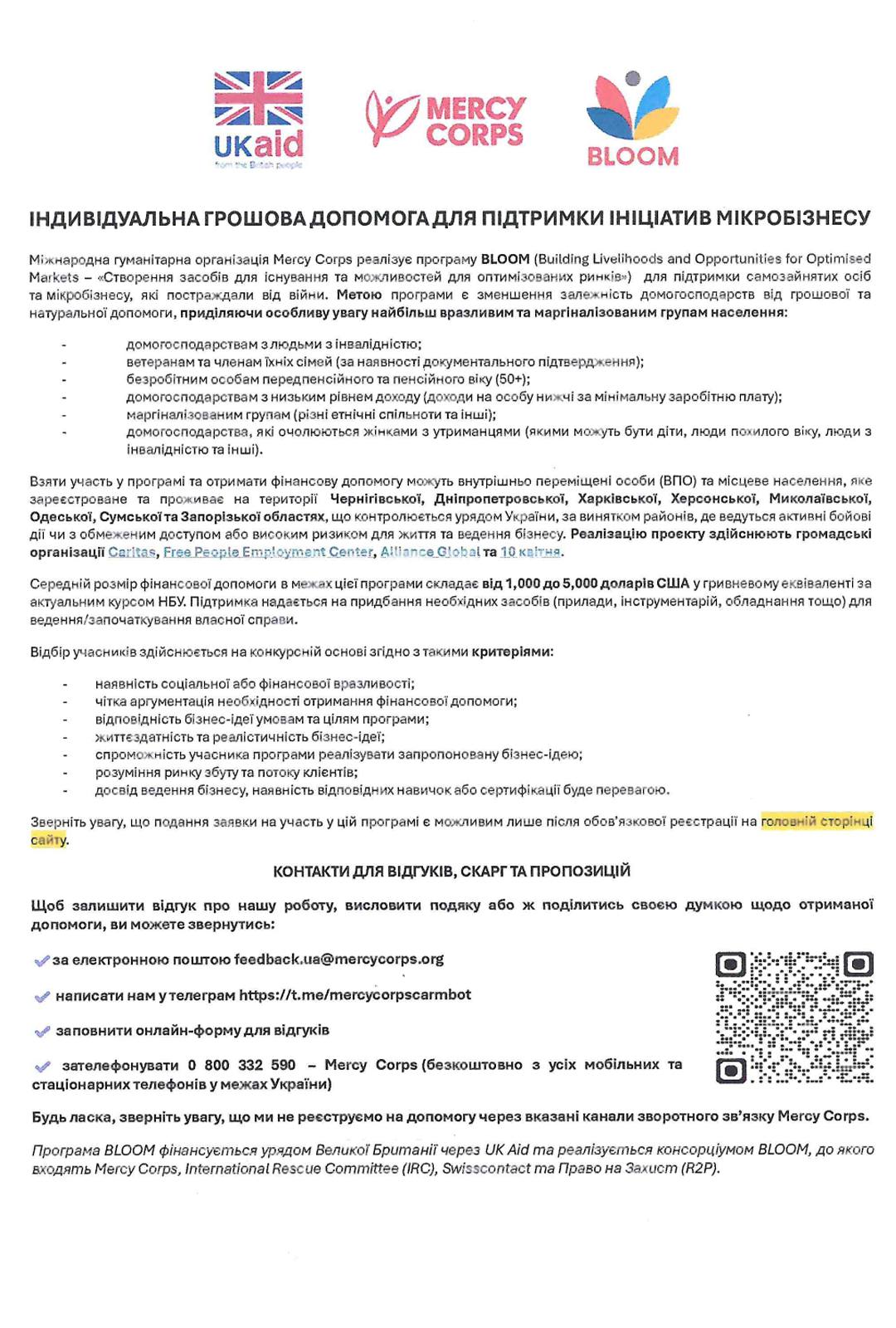 ## Оголошення: Міжнародна організація Mercy Corps допомагає самозайнятим особам та мікробізнесам в Україні