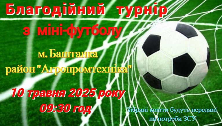 З метою підтримки ЗСУ, Баштанський районний суд оголошує благодійний турнір з міні-футболу. Це чудовий спосіб об’єднатися, продемонструвати свою підтримку та зробити внесок у важливу справу. Запрошуємо команди силових структур та всіх охочих взяти участь у цьому незвичайному зборі коштів. Ми віримо, що кожен внесок має значення, і разом ми зможемо зробити більше для наших захисників.