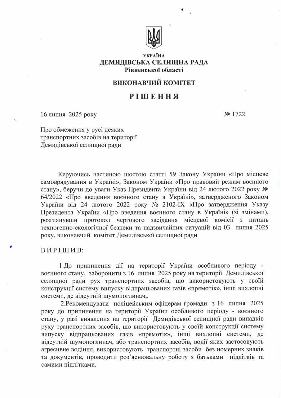 Згідно з рішенням виконавчого комітету від 16 липня 2025 року №1722, на території Демидівської селищної ради запроваджено обмеження на рух транспортних засобів. Зокрема, забороняється експлуатація автомобілів, у конструкції яких використовується система випуску відпрацьованих газів типу «прямотік» або інші вихлопні системи без належних шумопоглиначів. Ці заходи спрямовані на покращення екологічної ситуації та зменшення рівня шуму в населеному пункті.