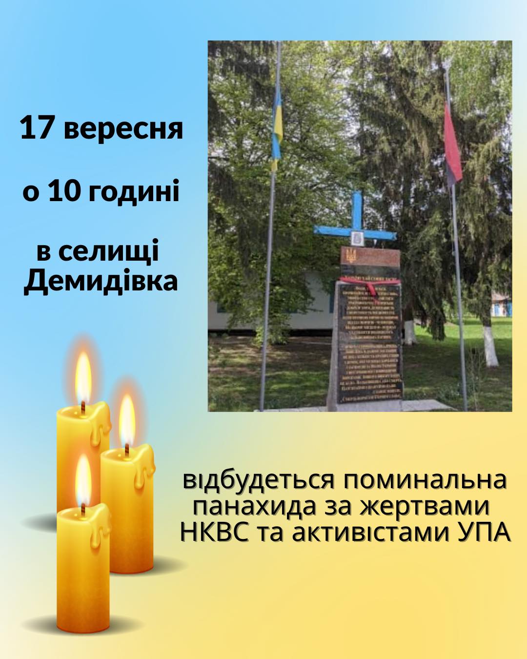 У середу, 17 вересня, о 10:00, біля пам’ятника жертвам НКВС у селищі Демидівка відбудеться поминальна панахида. Захід присвячений вшануванню пам’яті жертв репресій НКВС та полеглих активістів Української повстанської армії (УПА). Ця подія є важливим кроком у збереженні національної пам’яті та поглибленні розуміння трагічних сторінок нашої історії.