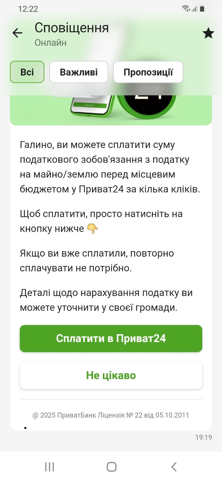 * **У мобільному застосунку Приват24:** Будь ласка, перевірте сповіщення у вашому обліковому записі Приват24. Система надсилає нагадування про важливі фінансові зобов’язання.