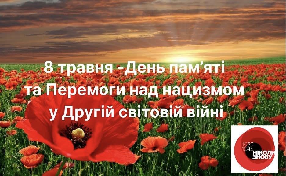 8 травня Україна відзначає День пам’яті та Перемоги над нацизмом у Другій світовій війні. Цей день нагадує нам про трагічні події 1939-1945 років, коли світ боровся проти нацистської загрози. Ми зупиняємось, щоб вшанувати пам’ять мільйонів жертв Другої світової війни, тих, хто відважно боровся проти нацизму на фронтах, у тилу, в лавах опору та в серцях окупованих міст. Це день глибокої скорботи та історичної пам’яті, день вдячності та шани. У 2023 році, відповідно до Закону України, ми підтвердили нашу солідарність з європейським баченням: ми не святкуємо – ми вшановуємо. Відзначення цього дня є надзвичайно важливим для збереження пам’яті про жахливі події минулого та для розуміння цінності миру.