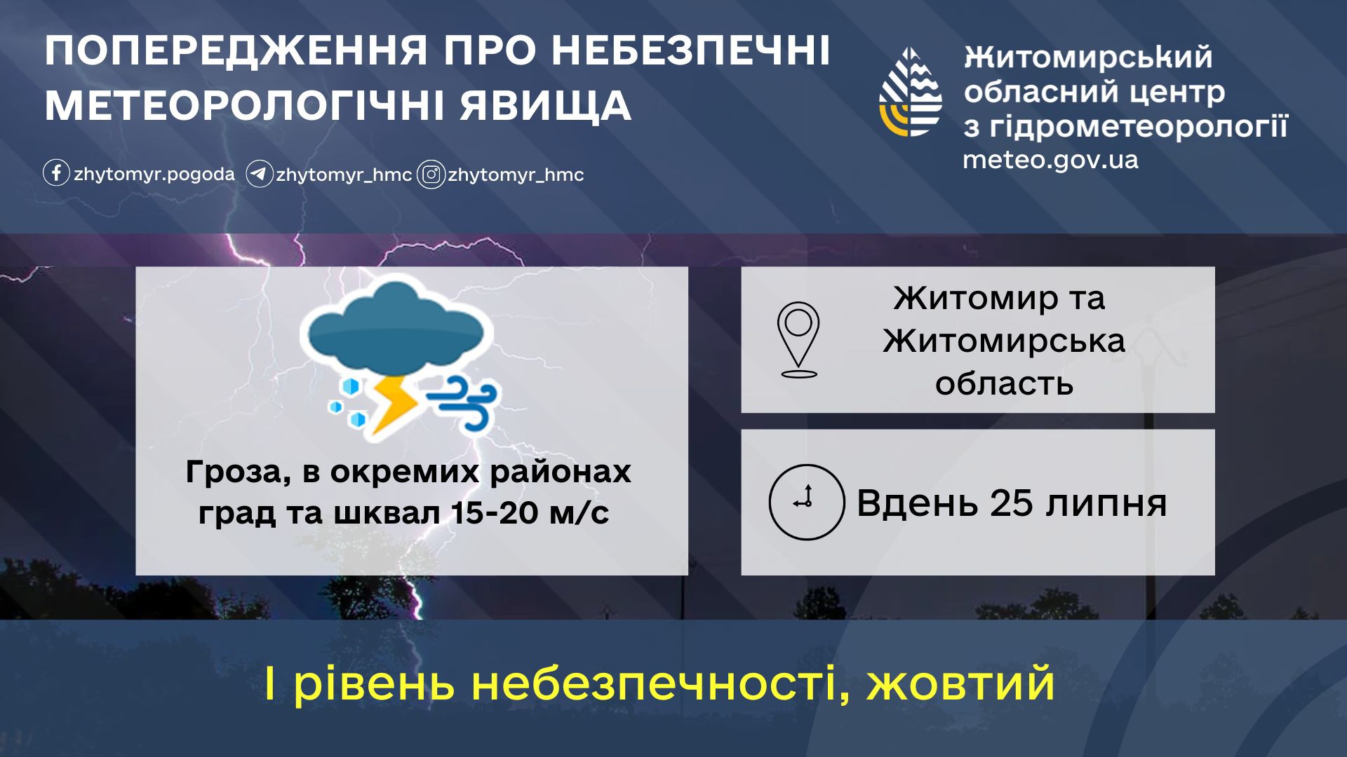 За даними Житомирського обласного центру з гідрометеорології, сьогодні, 25 липня, у місті Житомирі та на території Житомирської області прогнозуються складні погодні умови. Очікується гроза, а в деяких районах також град та шквал вітру швидкістю 15-20 м/с.