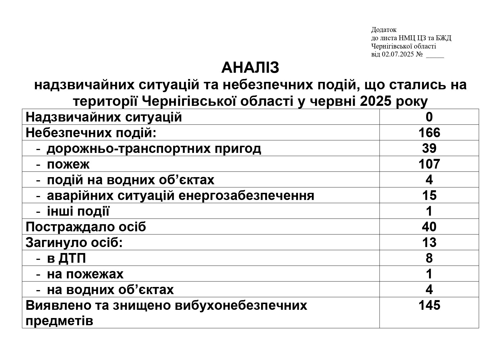 Надаємо вам аналіз надзвичайних ситуацій та небезпечних подій, що сталися на території Чернігівської області за червень 2025 року.