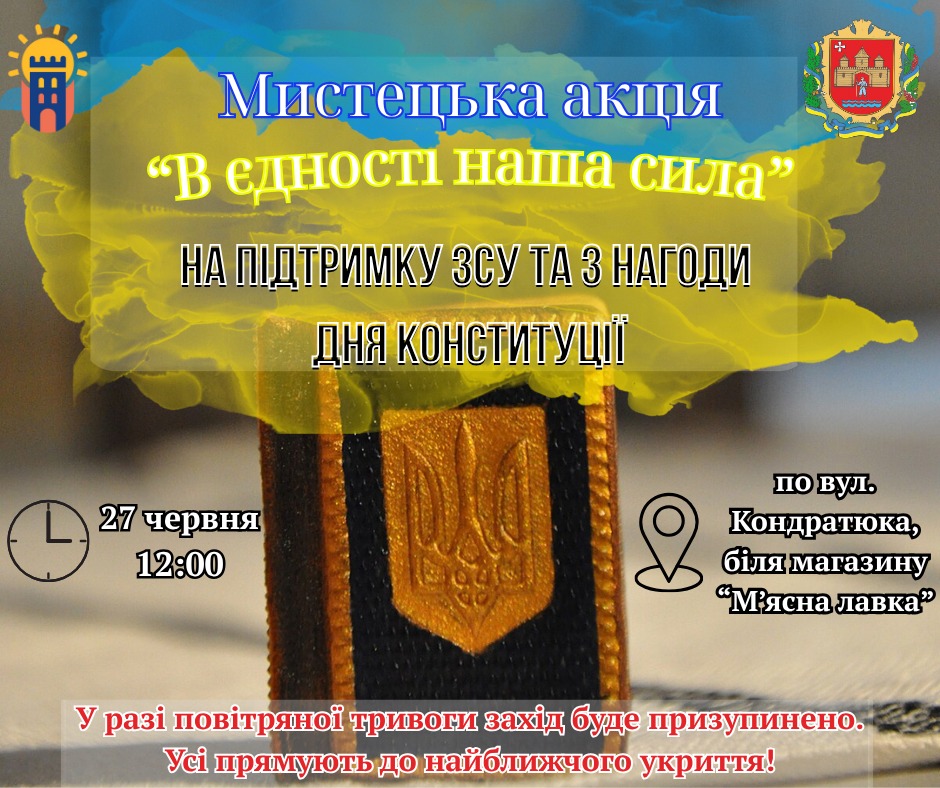 📌 27 червня о 12:00 по вулиці Максима Кондратюка, біля магазину “М’ясна лавка”, відбудеться мистецька акція «В єдності наша сила».