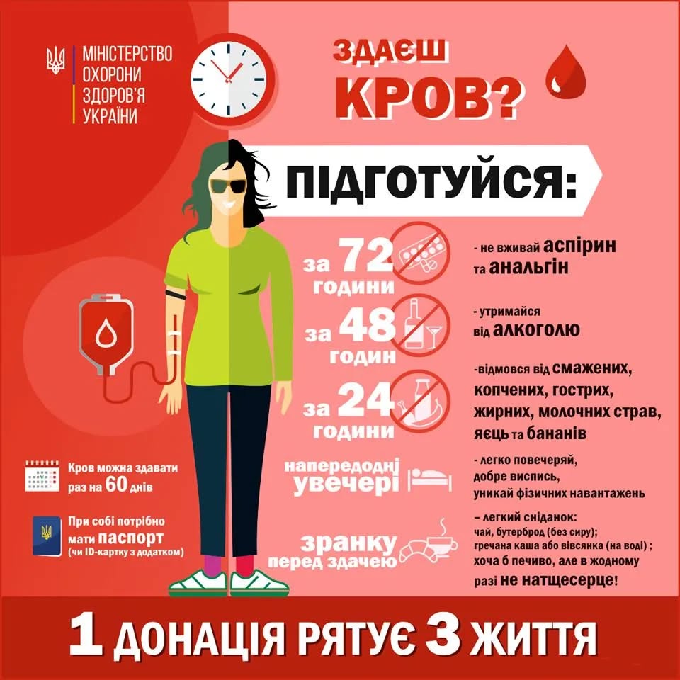 Хто може стати донором? Будь-яка здорова повнолітня людина вагою від 50 кг. Медичні протипоказання до донорства крові є мінімальними, і більшість дорослих громадян України мають можливість стати донорами. Група крові чи резус-фактор не є перешкодою для донорства.