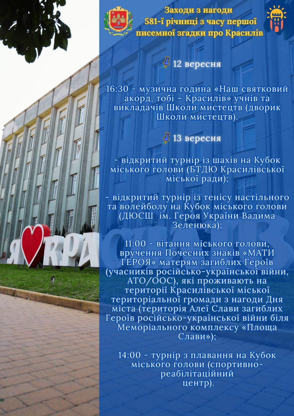 Приходьте, відзначайте разом з нами 581-шу річницю Красилова! Нехай це свято стане символом нашої єдності, любові до рідної землі та віри у майбутнє нашої громади.