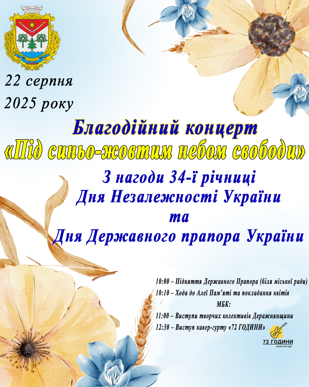 🇺🇦 Шановні мешканці та гості Деражнянської громади! Запрошуємо вас відзначити День Незалежності України та День Державного Прапора України разом з нами. Святкові заходи розпочнуться вже завтра, 22 серпня. Ми підготували насичену програму, яка дозволить кожному відчути гордість за нашу країну та вшанувати її героїв. Святкування дня незалежності та дня державного прапора є важливою подією для кожного українця, що об’єднує нас навколо спільних цінностей та майбутнього. Цей день – нагода згадати про боротьбу за свободу та суверенітет, про тих, хто віддав своє життя за незалежність України. Приєднуйтесь до нас, щоб разом відзначити ці знаменні дати! Ваша присутність зробить свято ще більш урочистим та незабутнім. Ми віримо в силу єдності та прагнемо, щоб цей день нагадав усім про важливість миру та свободи. День Незалежності України – це символ незламності духу та віри у майбутнє. День Державного Прапора України – це нагадування про нашу історію та національну ідентичність. Програма заходів: 10:00 – Урочисте підняття Державного Прапора України біля міської ради. Це символічний початок нашого свята, що започатковує день поваги до державних символів. 10:10 – Церемонія покладання квітів до Алеї Пам’яті. Вшануймо пам’ять тих, хто боровся за вільну Україну. 11:00 – Святковий концерт за участю творчих колективів Деражнянщини. Насолоджуйтесь виступами талановитих місцевих митців. 12:30 – Запальний виступ кавер-гурту «72 ГОДИНИ». Відмінний музичний супровід гарантовано! Долучайтеся до спільного святкування, яке об’єднає громаду у цей важливий день.