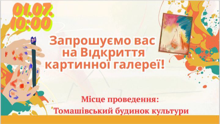 Шановні мешканці та гості Томашівської громади! З великою радістю запрошуємо вас на знакову культурну подію, яка обіцяє стати справжнім святом для поціновувачів мистецтва. Вже 01 липня, о 10:00, двері Томашівського будинку культури відчиняться для всіх бажаючих відвідати унікальну звітну пост-пленерну художню виставку картин. Ця подія стане чудовою нагодою поринути у світ творчості та насолодитися роботами талановитих українських митців. Приходьте та підтримайте наших художників, які втілюють свої ідеї на полотні! Розглядаючи кожну картину, ви відчуєте неперевершену енергетику, вкладену в них. Художня виставка Томашівка є важливою подією для громади. Це місце, де мистецтво зустрічається з життям, де кожен мазок пензля розповідає історію, а колір передає емоції. Українські митці, представлені на цій виставці, є справжніми майстрами своєї справи, які пройшли спеціальні пленери, щоб увібрати в себе красу природи та перенести її на полотно. Саме тому картини, що будуть експонуватися, наповнені особливою атмосферою та щирістю. Завітайте на цю особливу художню виставку в Томашівці, щоб на власні очі побачити результат їхньої натхненної праці. Це чудова можливість для жителів та гостей громади долучитися до культурного життя та збагатити свій внутрішній світ. Не пропустіть нагоду познайомитися з новими творами мистецтва та провести час у приємній атмосфері.