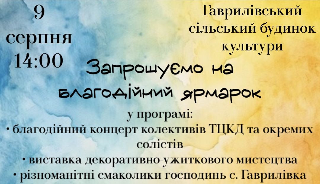 Запрошуємо вас на благодійний ярмарок та благодійниий концерт за участю колективів ТЦКД та окремих солістів, який відбудеться в суботу, 09 серпня о 14:00 в приміщенні Гаврилівського будинку культури.
