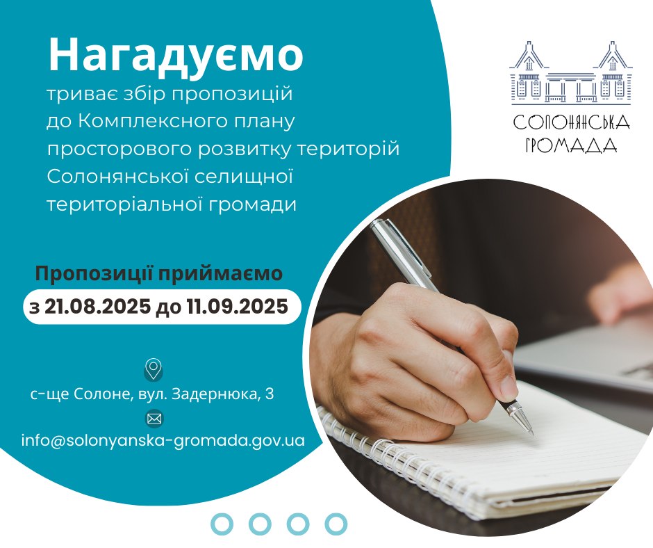 ℹ Шановні мешканці Солонянської громади! Нагадуємо, що до 11 вересня триває важливий етап – збір пропозицій до Комплексного плану просторового розвитку вашої громади. Це унікальна можливість взяти участь у формуванні майбутнього рідного краю.