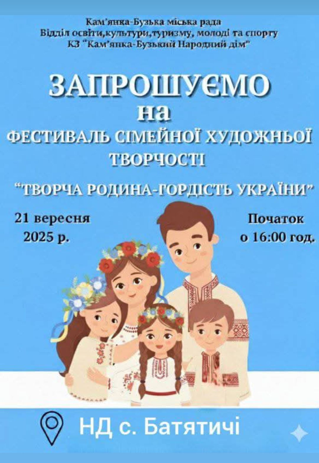 Не пропустіть можливість стати частиною цього яскравого свята! Дозвольте собі та своїм близьким зануритись у світ мистецтва, натхнення та сімейної єдності. “Творча родина — гордість України!” – це подія, яка об’єднає громаду та залишить теплі спогади на довгі роки. Чекаємо на вас 21 вересня 2025 року в Народному домі села Батятичі!